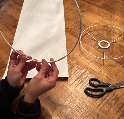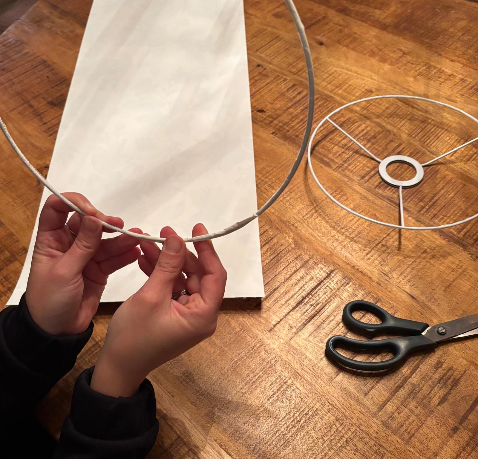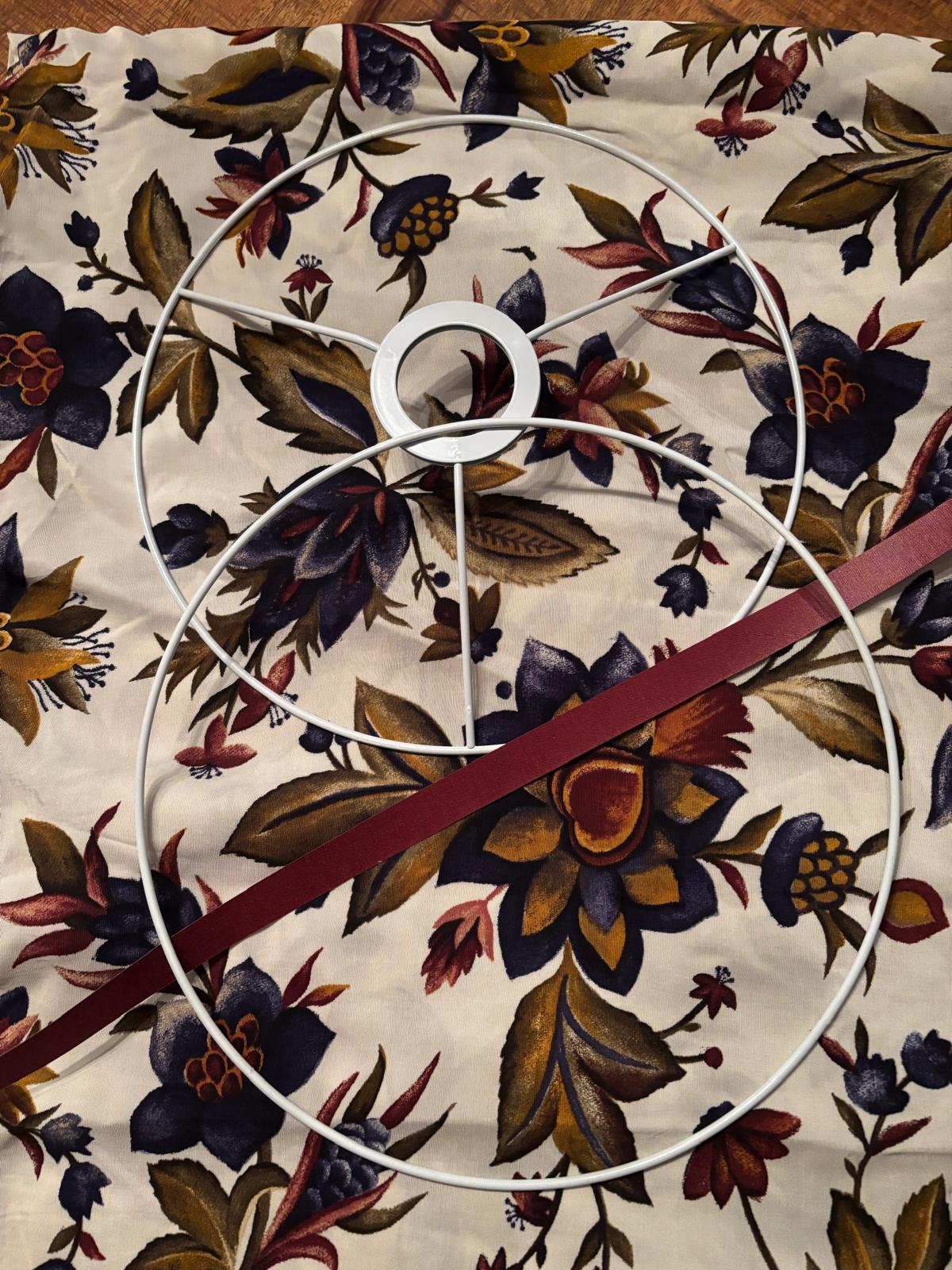 - Het standaard frame van de lampenkap, de lampenkapfolie en de uitgezochte stof (en evt afwerkband).
